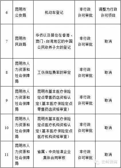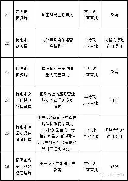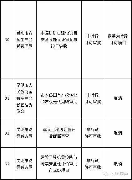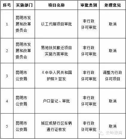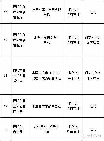 一、根据《国务院关于清理国务院部门非行政许可审批事项的通知》(国发〔2014〕16号)明确的清理非行政许可审批项目原则和《行政许可法》关于设立行政许可的规定,市政府决定全面取消市级非行政许可审批项目。我市现有33项非行政许可项目,其中市级非行政许可项目14项,承接省级非行政许可项目19项。清理后,取消22项,调整为行政许可11项(含2项部分调整)。取消调整后,昆明市不再保留非行政许可审批类别。