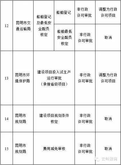 为贯彻落实党的十八届三中、四中全会精神和《国务院关于清理国务院部门非行政许可审批事项的通知》(国发〔2014〕16号)、《云南省人民政府关于进一步精简行政审批项目的决定》(云政发〔2014〕70号)要求,进一步深化行政审批制度改革,加快政府职能转变,市政府决定取消和调整一批行政许可审批项目。现将有关事项通知如下: