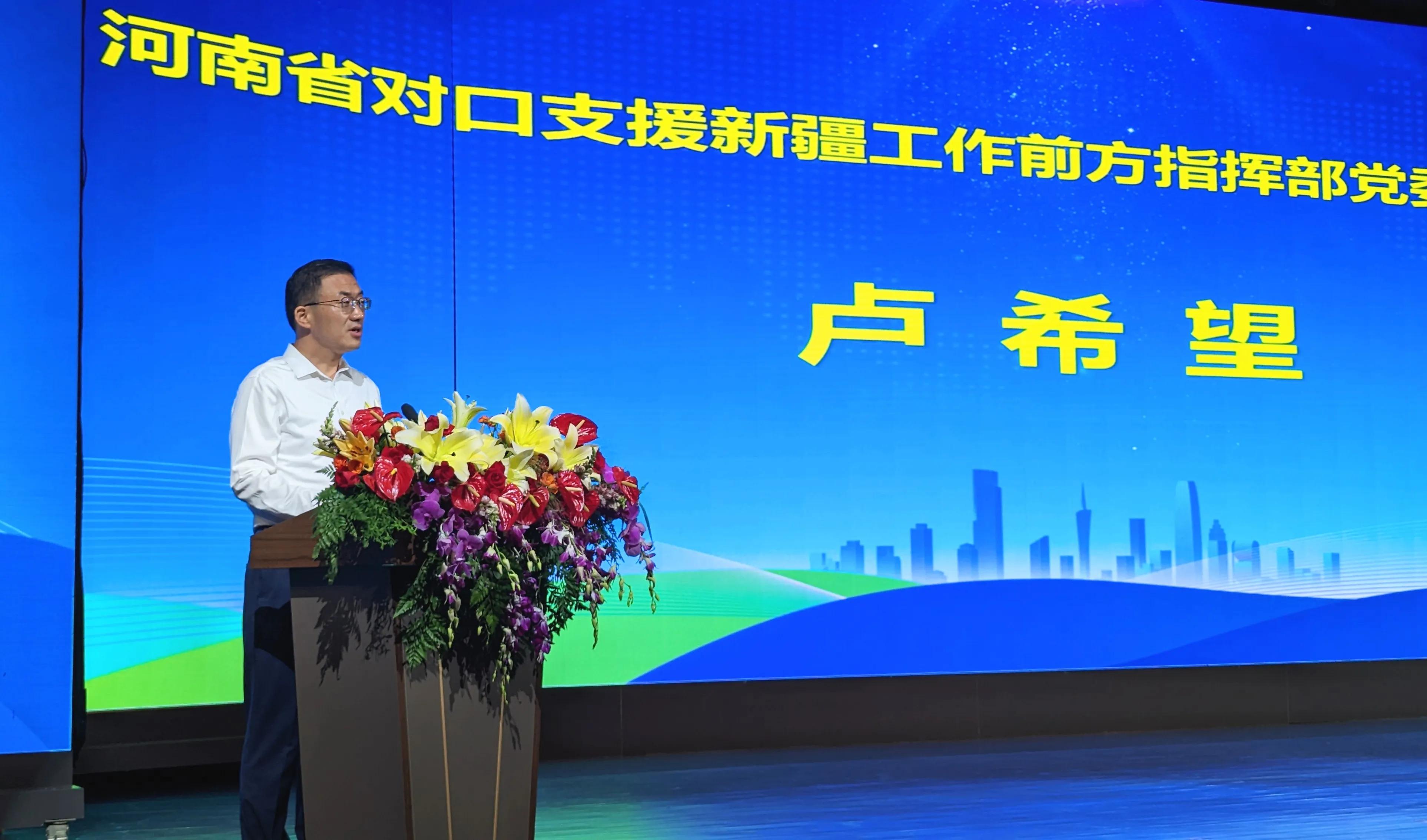 河南省对口支援新疆工作前方指挥部党委书记、总指挥卢希望在致辞中说:“天山嵩山根连根,河南新疆一家亲。目前,在疆的河南人有400多万,河南在医疗援疆、教育援疆、产业援疆及人才援疆下,取得了显著成绩,大批援疆干部在新疆献热血、献青春、献智慧,与新疆各族人民结下了深厚友谊,留下来一段段的佳话。